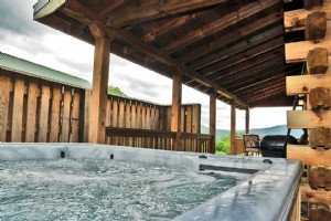 Our Luxury 'Hillside' Cabin offers a well appointed loft bedroom with a queen bed and a private full bath... plus 2 spacious bedrooms on the lower level; one with a queen bed & one with 2 twin beds, which share the second full bath... the covered side porch has a large hot tub with a privacy fence to encourage relaxation, and the front deck offers a view of the mountains, as well as breath-taking sunrises each morning.