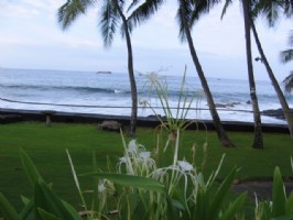 A delightful Ocean condo located right across scenic Alii Drive.It offers panoramic ocean and sunset view from the lanai,living room, kitchen and bedroom. Feel the ocean breeze, watch and listen to the waves crushing against the shore.In Kona town.