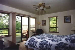 The "Round House" consists of one large bedroom with a queen size bed and also comes equipped with a queen sized pull out couch in the living room. This house is decorated in oriental motif with attention to detail such as the high ceilings and ceiling fans to hand woven wooden blinds. The bathroom features a Jacuzzi tub for two with a shower. The kitchen is fully equipped with refrigerator, stove, microwave, coffee maker, toaster, dinnerware & utensils. The comfort of the living room is enhanced by the luxury of having a 27" color TV with VCR for your pleasure.