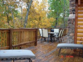 Among the huge trees, this secluded real log cabin includes a cozy whirlpool bath, a outdoor spa on the huge wrap deck, fireplace (we supply the wood), 3 wonderfully decorated bedrooms, 2 full bathrooms, huge fully equipped kitchen, lounge chairs on deck to enjoy the wild life or numerous stars, outdoor grill on deck, cable TV/DVD, free broadband internet access, washer and dryer in house. All this overlooking the 9-hole golf course steps from the deck. Unlimited golf is included too! While enjoying the real log cabin you can take full advantage of the beautiful Ozarks and the surrounding Branson Lakes area, spend the day at Silver Dollar City, shop the malls, hike the mountains, tour Dogwood Canyon, browse the antique shops, take in a great show at a live theatre or play your favorite games at the amusement outlets, play a round of golf or several rounds of miniature golf, grab a quick bite at a fast food spot or enjoy a great dining experience at a fine restaurant--the list goes on and on--and the choice is yours when you experience one of the newest real log cabins in the area.